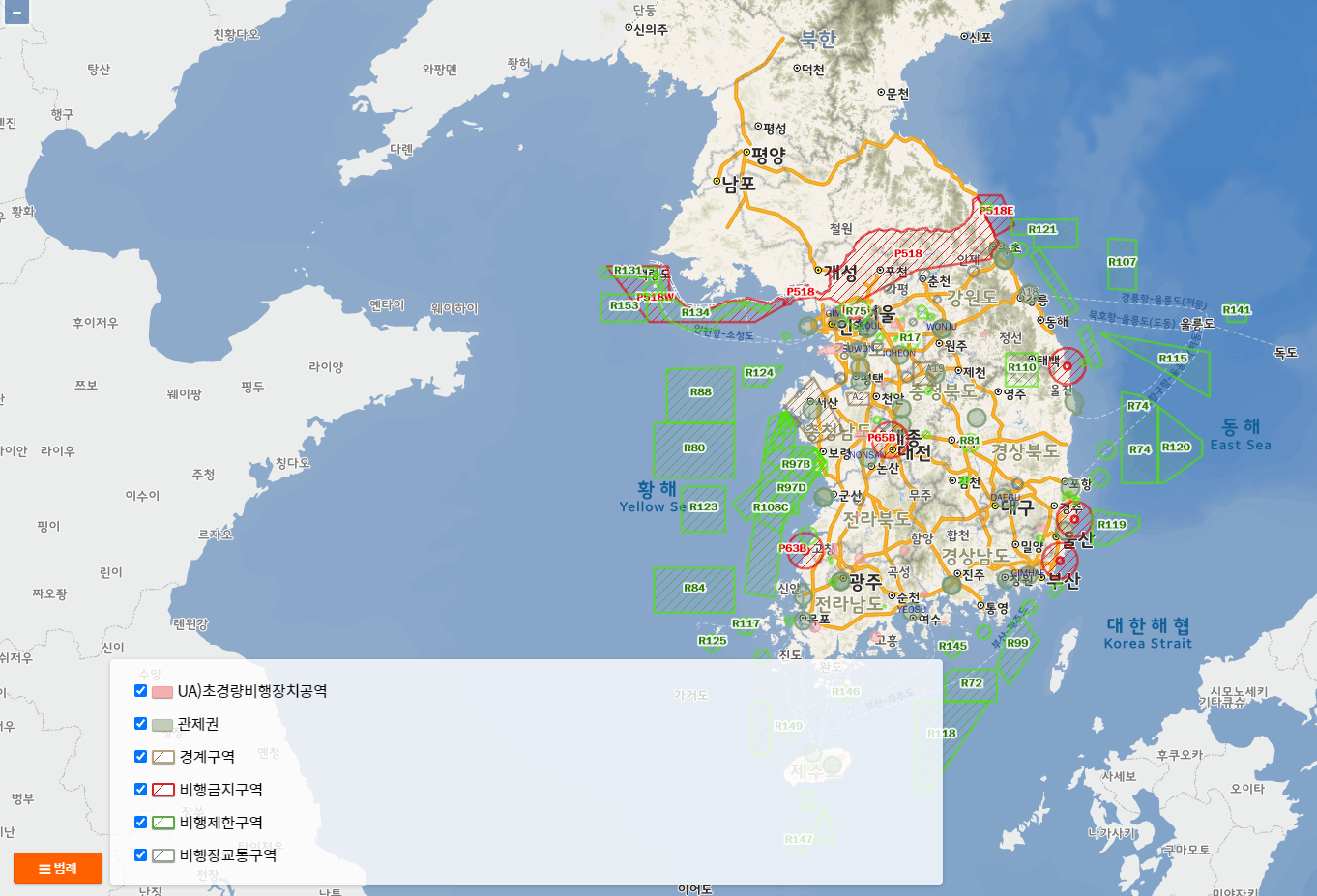 드론 비행가능 지역을 한눈에도 볼수 있게 되어 있는데요.